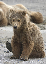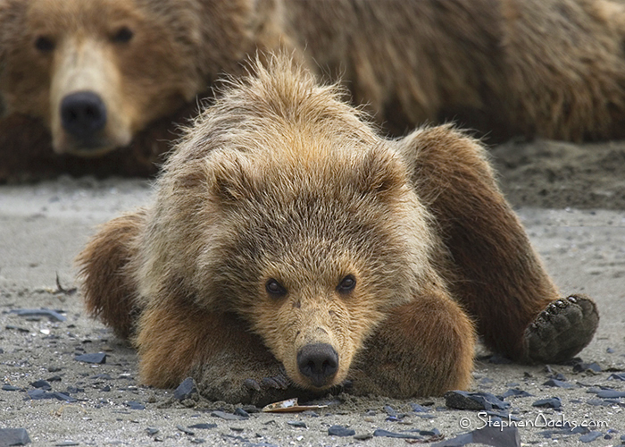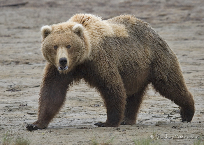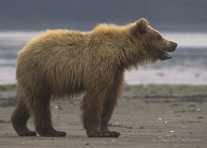 After that, we returned to camp for lunch and a short rest before returning to the tidal flats, where we encountered Rosie and cubs once again. This time they were out in the middle of the flats digging for clams. We made our way toward them for another photo opportunity. Kevin had taught us never to walk directly toward the bears, but rather to weave and move slowly. We got within roughly 100 yards and sat down in the sand, where we watched and photographed for about a half an hour. Then Scooby, who had also been clamming nearby, decided to come within about 20 yards of us, watched us for a short time, and then went on his way.