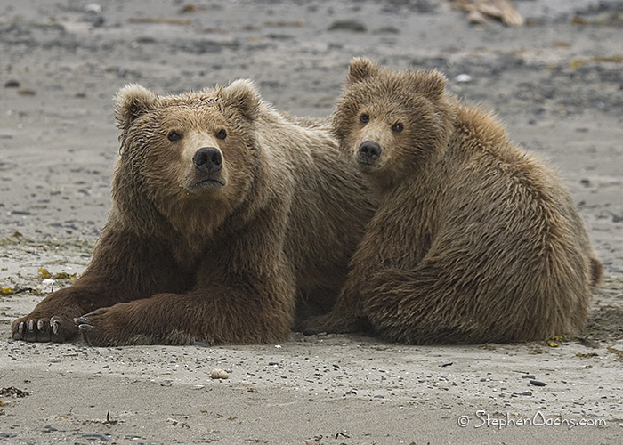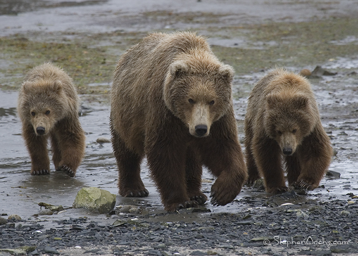 The storm that kept us from departing the day before was still hanging heavy over Hallo Bay. Once the rain subsided, we made our way back to the beach, where we saw Blondie in the distance. The tide was out and she and her cubs were eating barnacles off the rocks. Our guide wanted to give her plenty of space because of how close we'd gotten previously, so we sat and watched from a couple hundred yards away.