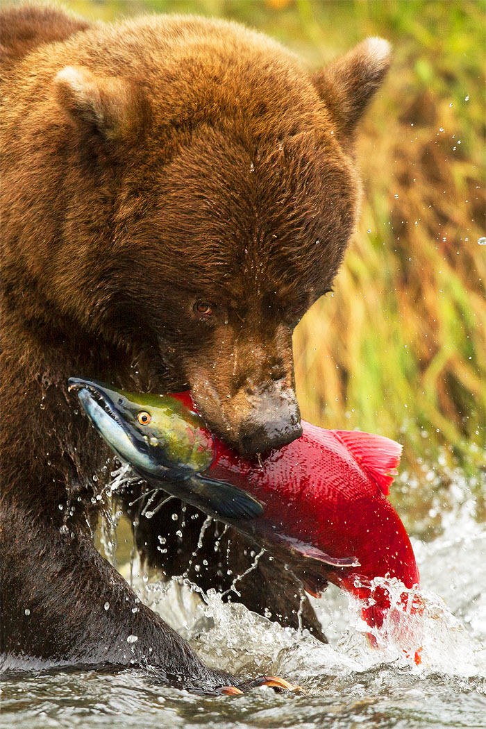 Brown bears contribute to the great circle, with the ability to eat as many as 20 salmon per day. In this photograph, an Alaska coastal brown bear (Ursus arctos) emerges from the water with a bright red Sockeye salmon -- one of many catches he'll make during a time of year where his mission is to do nothing more than fatten up for the long winter hibernation ahead.