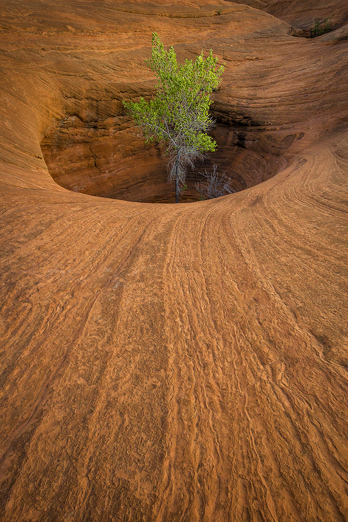 This little Cottonwood tree found its roots in the most unlikely of places -- a small pothole warn by erosion in the middle of a giant sandstone formation.