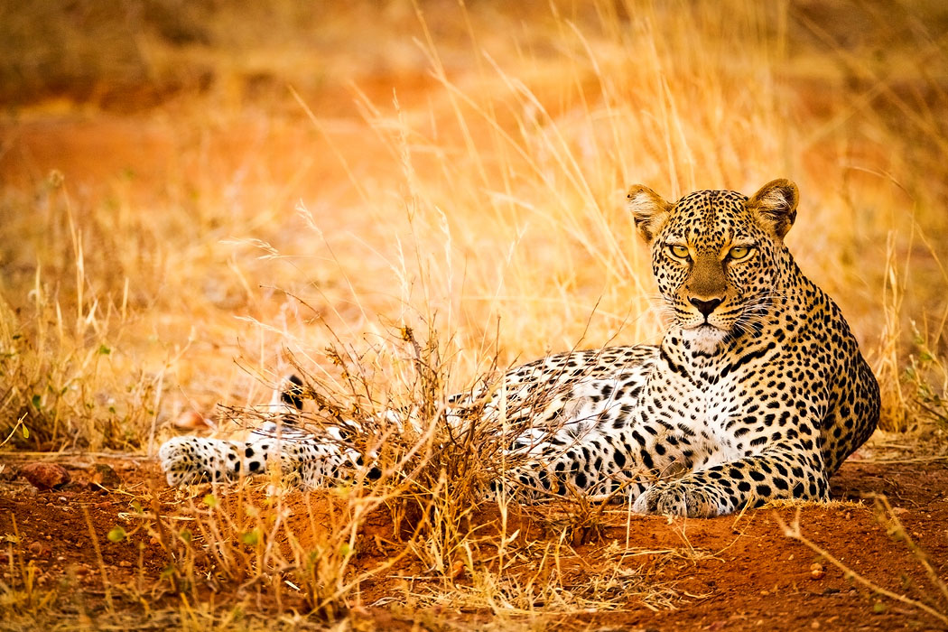 This beautiful young leopard was photographed in Samburu, Kenya, Africa, as he watched grazing Impala in the distance. The iron rich soil and golden grasses of the central desert region of Kenya act as the perfect camouflage for this beautiful, but lethal predator.
