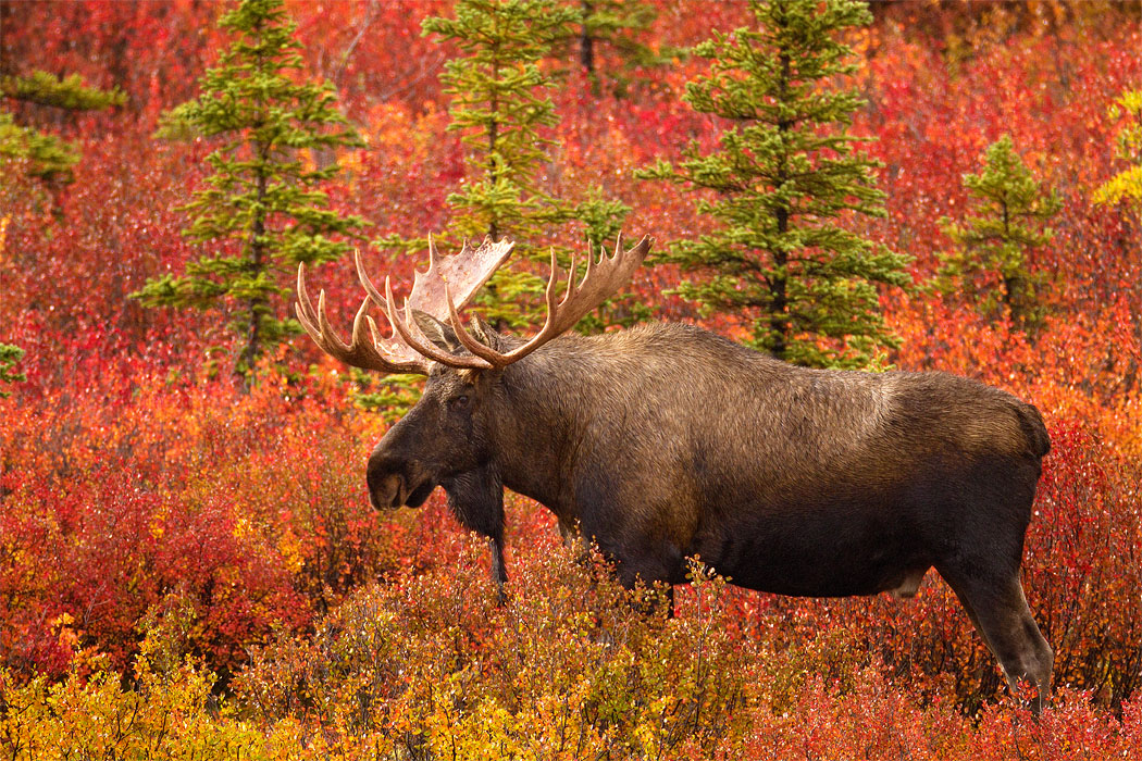 This image captures the beauty of an Alaskan bull moose standing against an early fall backdrop of tundra brush in Denali National Park. Mating season is just beginning....