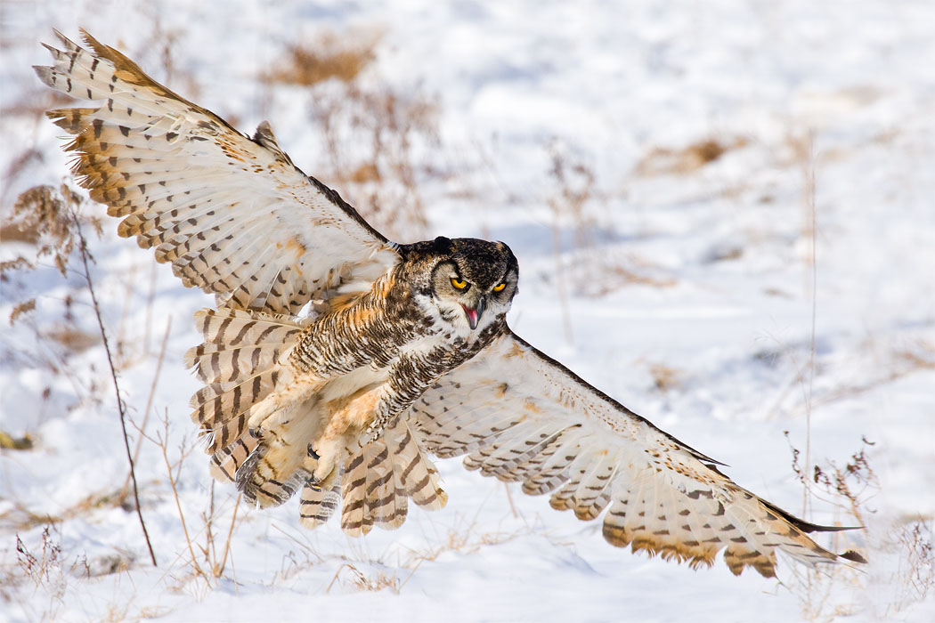 This marvelous capture was taken in southern Ontario; a rare shot of this nighttime hunter still in predatory pursuit just as the day was beginning. Completely unaffected by the subzero temperature, he effortlessly pursued his target. With devastating strength, he could easily carry off prey several times his own weight. This morning, however, he returned to his nest empty-taloned.