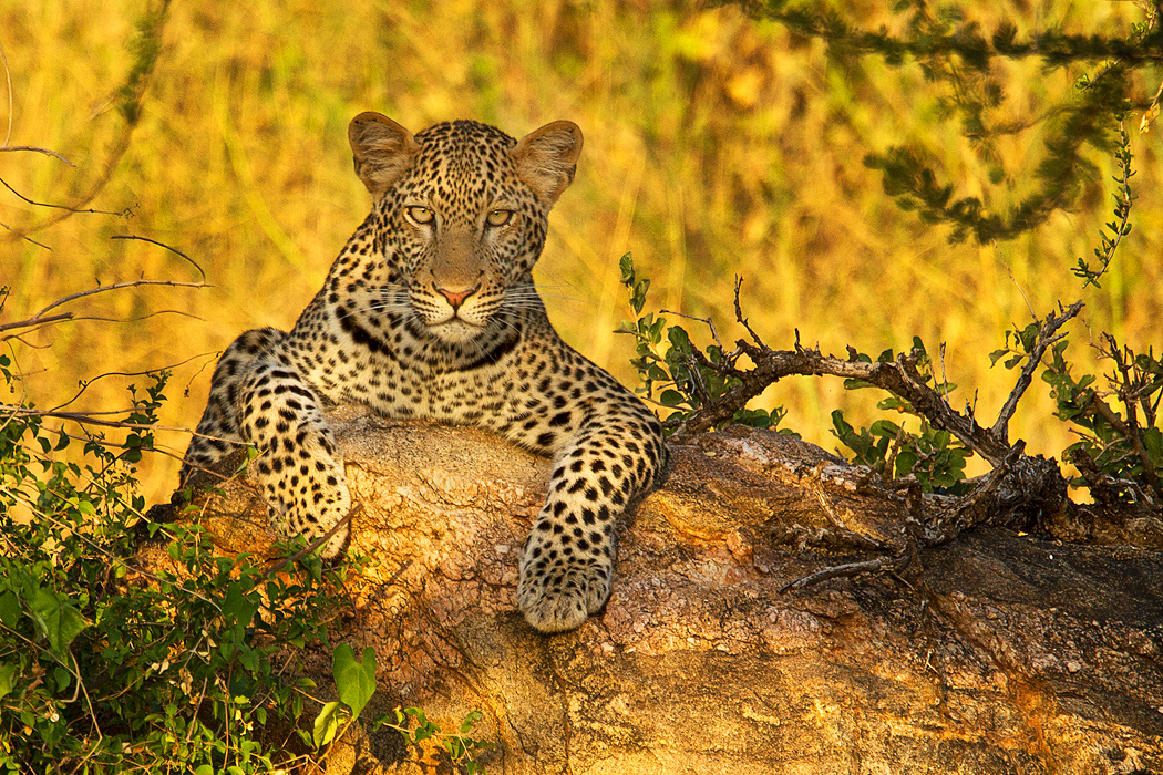 This beautiful young leopard was photographed in Samburu, Kenya, Africa, while warming himself on a rock, basking in the early morning light. While his intimidating gaze draws you into his world, a low, golden sunlight bathes the scene in rich, warm tones that embody this incredible animal.
