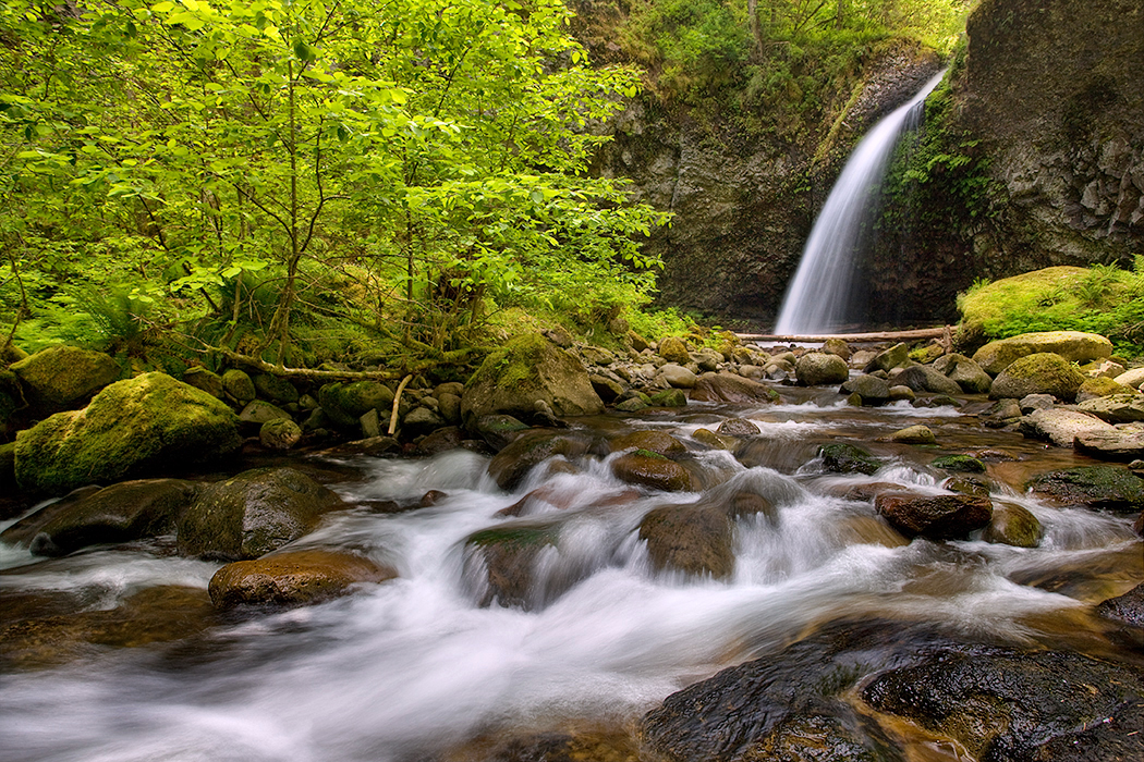 There are four spectacular waterfalls along Oneonta Creek. This photograph shares how the light plays with the fresh spring moss and foliage, while it elegantly frames the rushing riverbed. The camera's eye focuses on the life of one of Oneonta's falls, capturing the energy of the rushing water as it continues on its journey down the Columbia river to the sea.