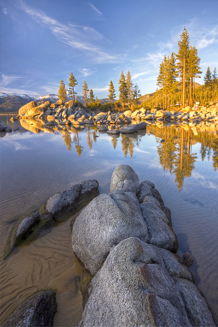 Breathtaking Sand Harbor, on Nevada's east shore of Lake Tahoe, is unique for its white, fine-grained sandy beach. Most of the beaches on the Nevada side are course sand. The difference is thought to be due to the prevailing breezes that blow through Sand Harbor.