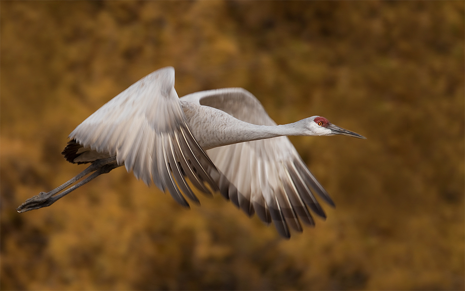 This sandhill crane at Bosque Del Apache was flying low at the end of a very cold New Mexico day. His position provided a richly colored backdrop, while a slower shutter speed allowed a slight blurring of his wings, lending further drama and motion to the capture.
