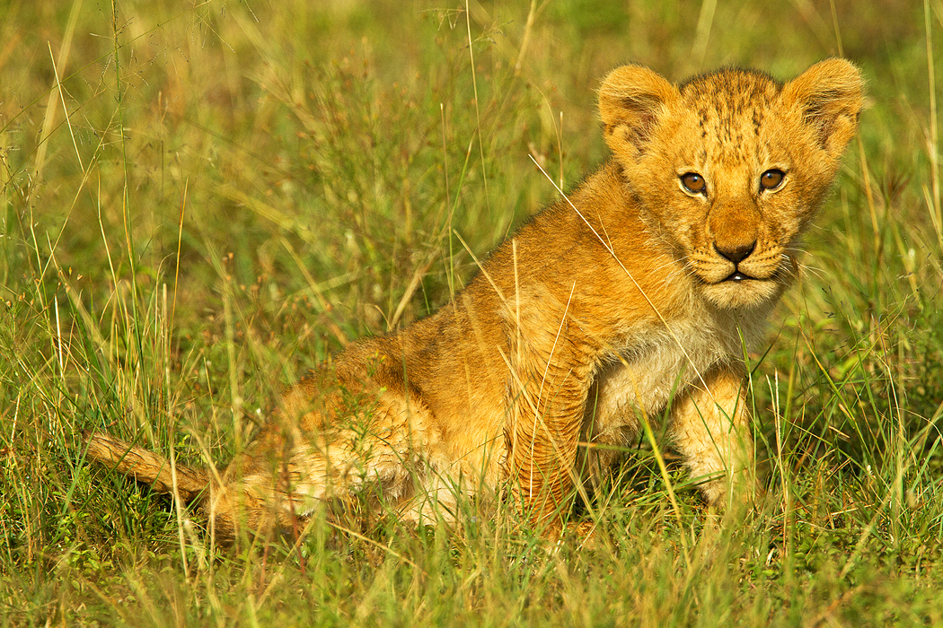 These predatory carnivores are iconic for their ferocity, bravery and strength. However, as with cats of any size, they can occasionally show a playful side. In this photograph, a young lion cub takes a few moments to play in the tall green savannah grasslands in the Masai Mara, in Kenya, Africa.