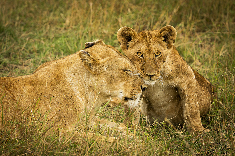 Covered in tiny flies, this curious lion cub looks on from the safety of his mother.