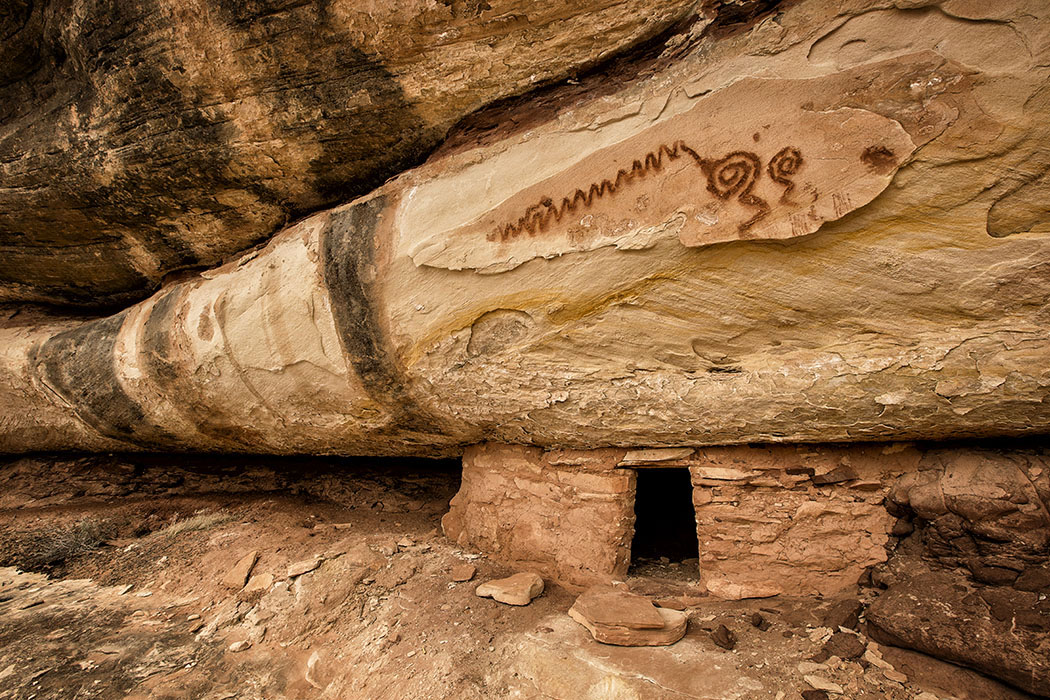 Located in a secluded alcove, on the Cedar Mesa Plateau, is a little granary built by the Anasazi people between 900 and 1100 AD. On the rock surface above this dwelling is the faint remnant of what was at one time a massive 12-15 foot pictograph rock art panel.