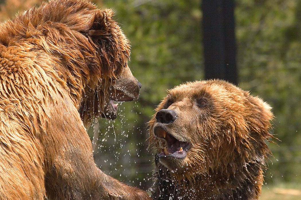 This photograph captures a rare look at grizzly behavior. The suspended water beads, tossed around by play "fighting" in a shallow stream, emphasize the intensity of the moment.