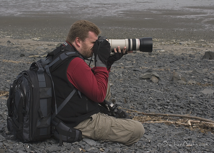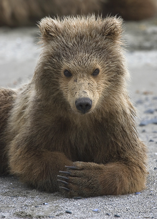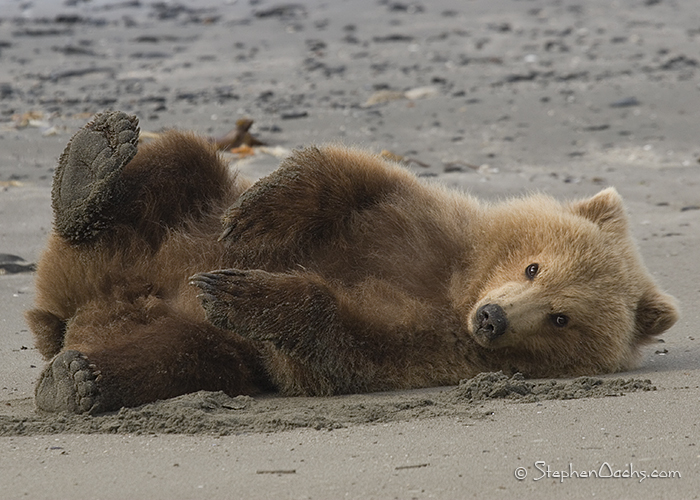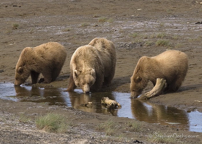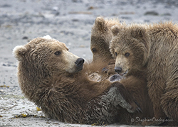 After that, we returned to camp for lunch and a short rest before returning to the tidal flats, where we encountered Rosie and cubs once again. This time they were out in the middle of the flats digging for clams. We made our way toward them for another photo opportunity. Kevin had taught us never to walk directly toward the bears, but rather to weave and move slowly. We got within roughly 100 yards and sat down in the sand, where we watched and photographed for about a half an hour. Then Scooby, who had also been clamming nearby, decided to come within about 20 yards of us, watched us for a short time, and then went on his way.