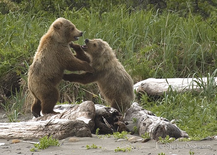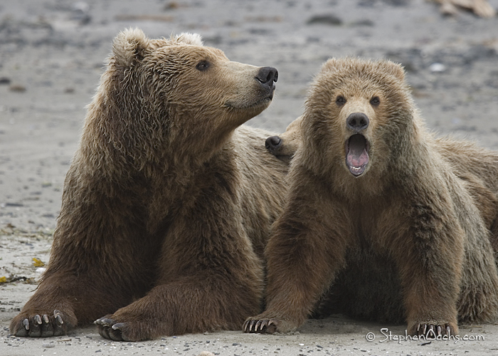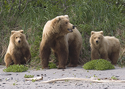 Kevin stood in front of us with a bear flare in hand. (A "bear flare" makes a loud pop and emits smoke and flames to deter a bear from attacking.) He quietly told us to "remain seated, and no matter what, do not stand, move or run." He spoke to the bear while trying to motion her around us. She was actually trying to get away from the approaching male, but we were in the path she wanted to take. Rosie and her cubs came within 10 yards of us before finally stopping.