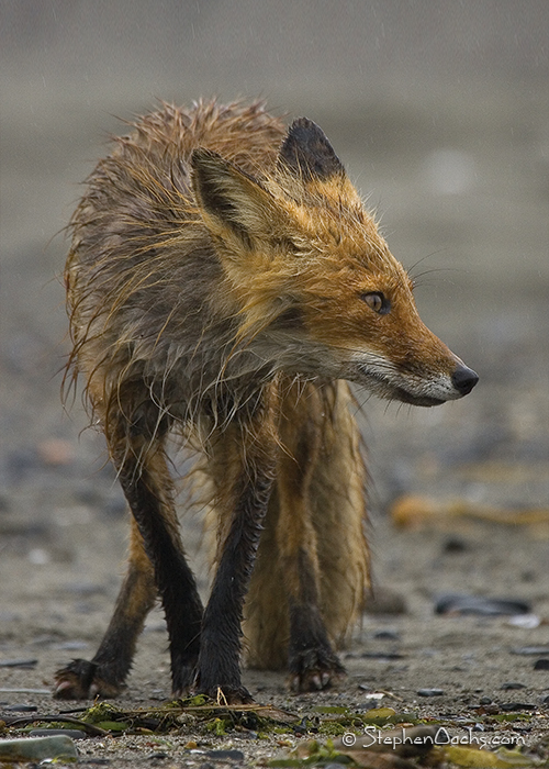 We awoke to rain and wind. The visibility in the bay was so poor that no plane would be able to approach and land; we would not be returning to Homer as scheduled. This is what our guide called being "weathered in." However, the weather improved enough to hike, so we left camp in search of more bear encounters. We saw a few bears on the tidal flats, but a curious, very wet red fox followed us down the beach, coming close enough to allow a few photographs to be taken.