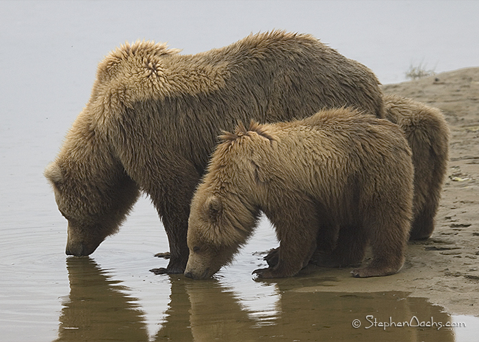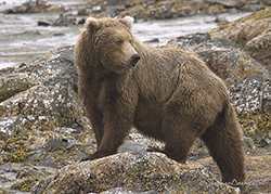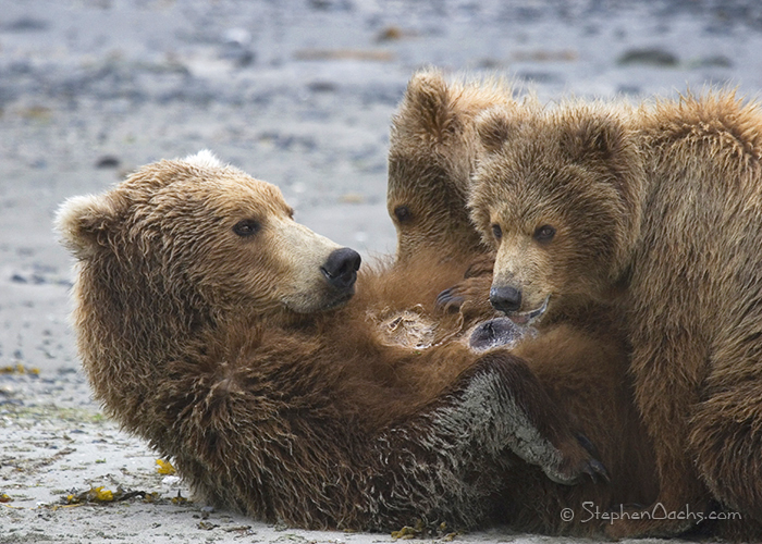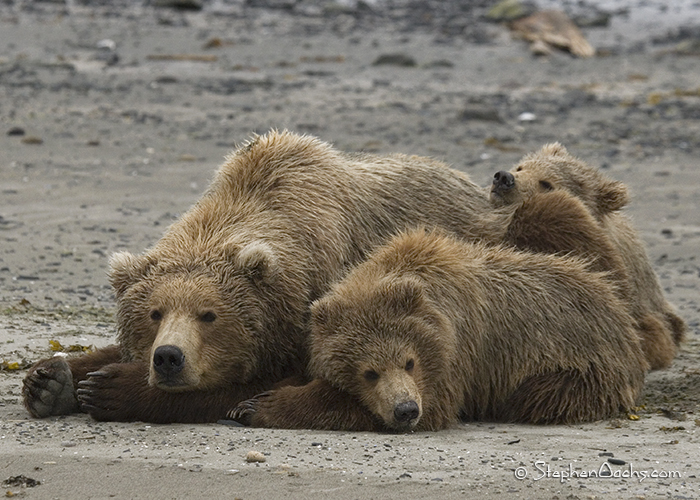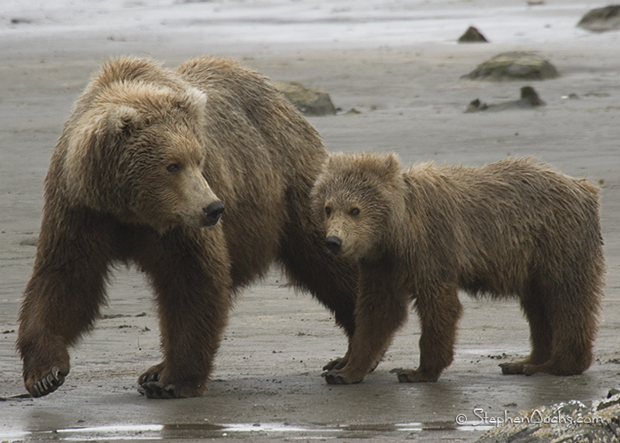 The storm that kept us from departing the day before was still hanging heavy over Hallo Bay. Once the rain subsided, we made our way back to the beach, where we saw Blondie in the distance. The tide was out and she and her cubs were eating barnacles off the rocks. Our guide wanted to give her plenty of space because of how close we'd gotten previously, so we sat and watched from a couple hundred yards away.