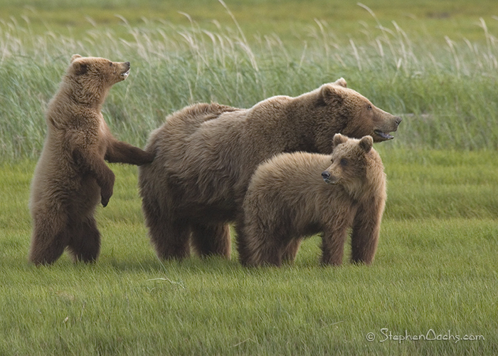 Sensing danger, Rosie began to pop her jaw and make low growling-type noises, which her cubs responded to immediately. As she drew them near, they began to leave the meadow, headed in our direction!