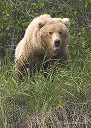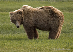 The meadow was a giant open area with an abundance of sedge grass, an early summer food source for these bears. We sat on some driftwood next to a Cottonwood tree and had a great view of both the meadow and the tidal flats. Within a short time, there were several bears in the meadow as well as behind us on the tidal flats. At one point, we counted seven grizzly bears within view, some as close as 50 yards.